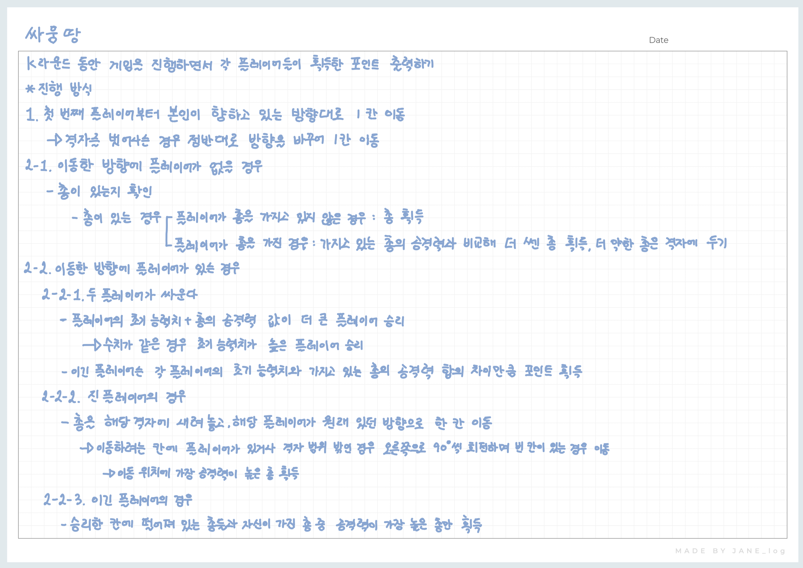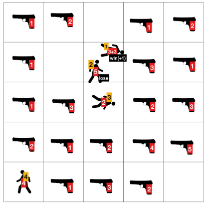 2-2-1. 만약 이동한 방향에 플레이어가 있는 경우에는 두 플레이어가 싸우게 됩니다. 해당 플레이어의 초기 능력치와 가지고 있는 총의 공격력의 합을 비교하여 더 큰 플레이어가 이기게 됩니다. 만일 이 수치가 같은 경우에는 플레이어의 초기 능력치가 높은 플레이어가 승리하게 됩니다. 이긴 플레이어는 각 플레이어의 초기 능력치와 가지고 있는 총의 공격력의 합의 차이만큼을 포인트로 획득하게 됩니다.