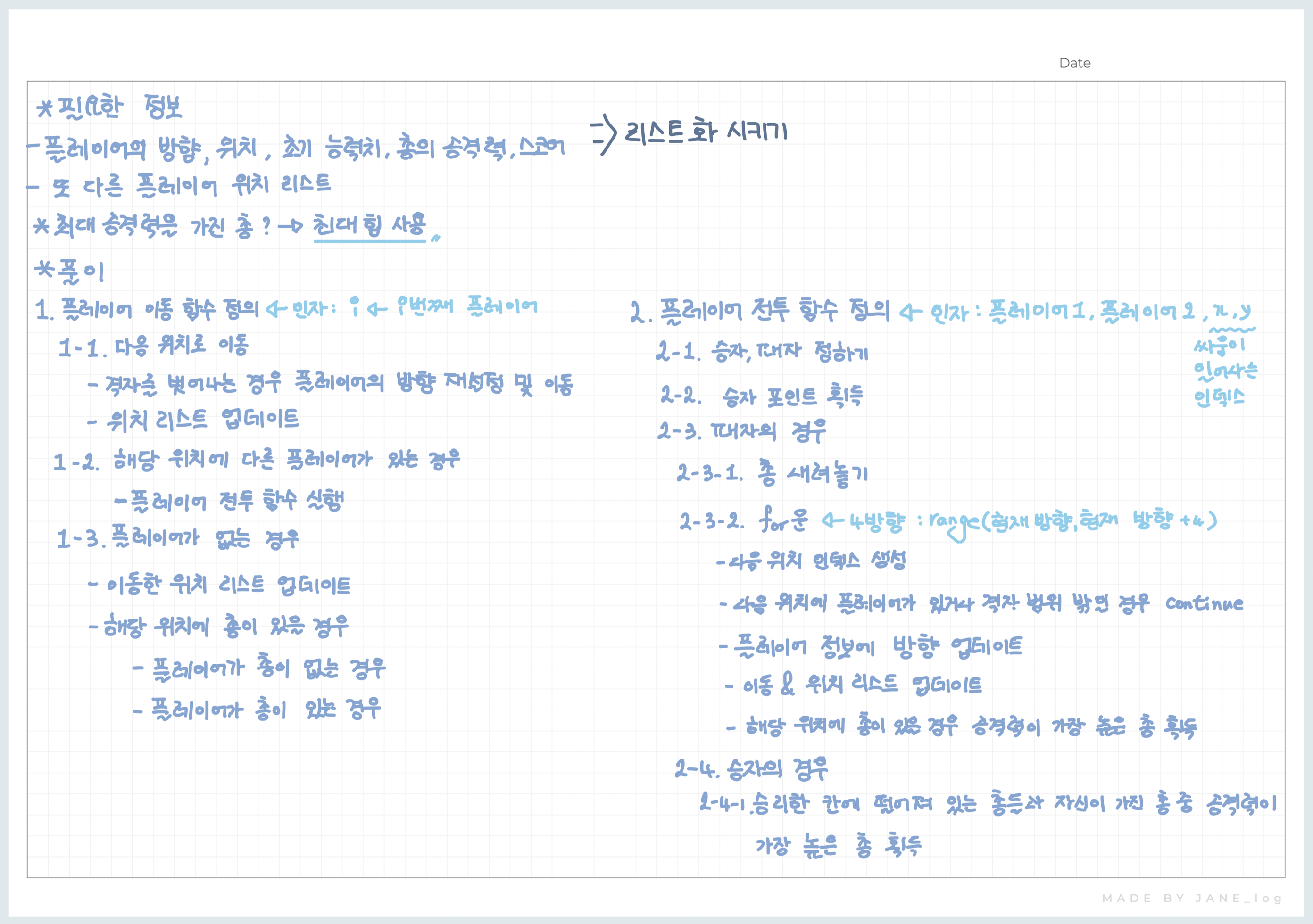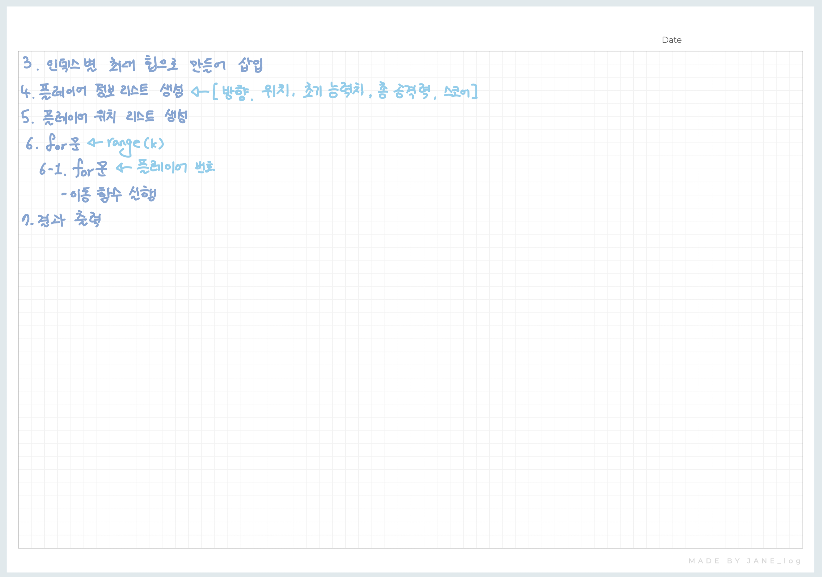 # 4. 플레이어 정보 리스트 생성 -> [방향, 위치 x, 위치 y, 초기 능력치, 총 공격력, 스코어]