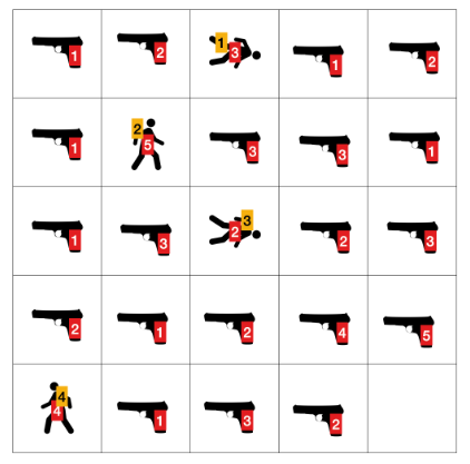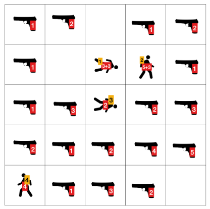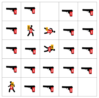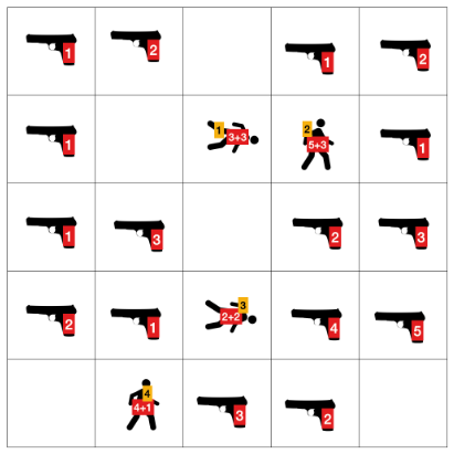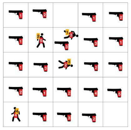 각 플레이어의 위치는 겹쳐져 주어지지 않으며, 플레이어의 초기 위치에는 총이 존재하지 않습니다.