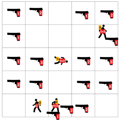 2-2-3. 이긴 플레이어는 승리한 칸에 떨어져 있는 총들과 원래 들고 있던 총 중 가장 공격력이 높은 총을 획득하고, 나머지 총들은 해당 격자에 내려 놓습니다.