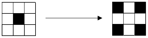 영정이는 숭실대 학교 앞, 원룸에서 자취를 한다. 원룸 자취방 방바닥에는 곰팡이가 서식하고 있는데, 곰팡이는 시간이 지날 때 마다 증식을 한다. 영정이의 자취방에서 서식하는 곰팡이는 특이한 방식으로 증식하는데, 어떤 한 지점에 곰팡이가 있었다면 그 위치에서 대각선 위 아래로 곰팡이가 증식되고 원래 곰팡이가 있던 자리는 곰팡이가 사라지게 된다. 아래 2번 그림과 같이 곰팡이가 사라지는 지점이자 다시 증식되는 지점이면 곰팡이는 증식된다.