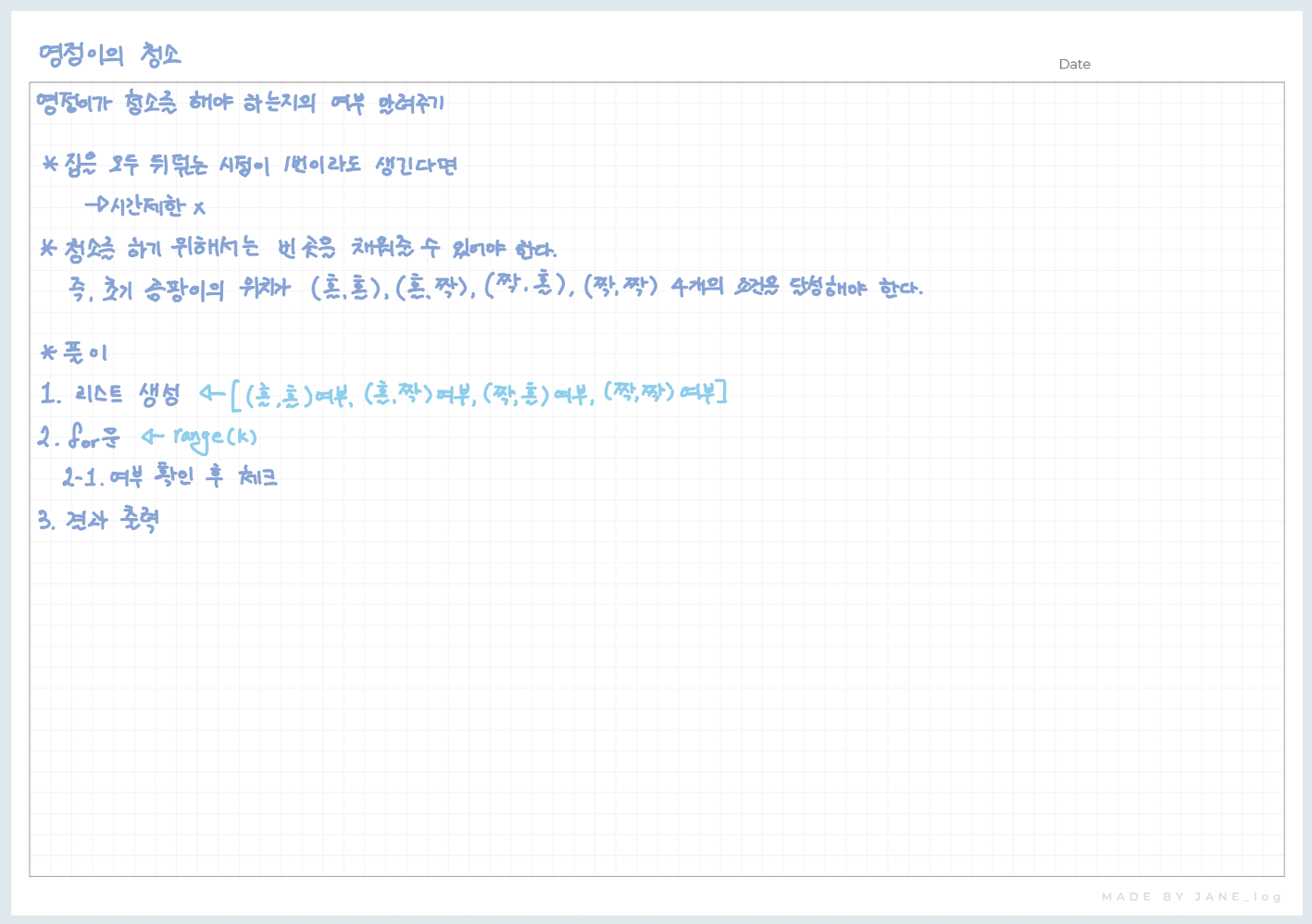 영정이는 매우 게으름이 많아 미래에 이 곰팡이가 자신의 집을 모두 뒤덮는 시점이 한번이라도 생길 것으로 예측되면 대청소를 하려고 한다. 영정이의 집의 크기와, 현재 곰팡이의 위치가 주어질 때, 영정이가 청소를 해야 하는지 안 해도 되는지 알려주자.