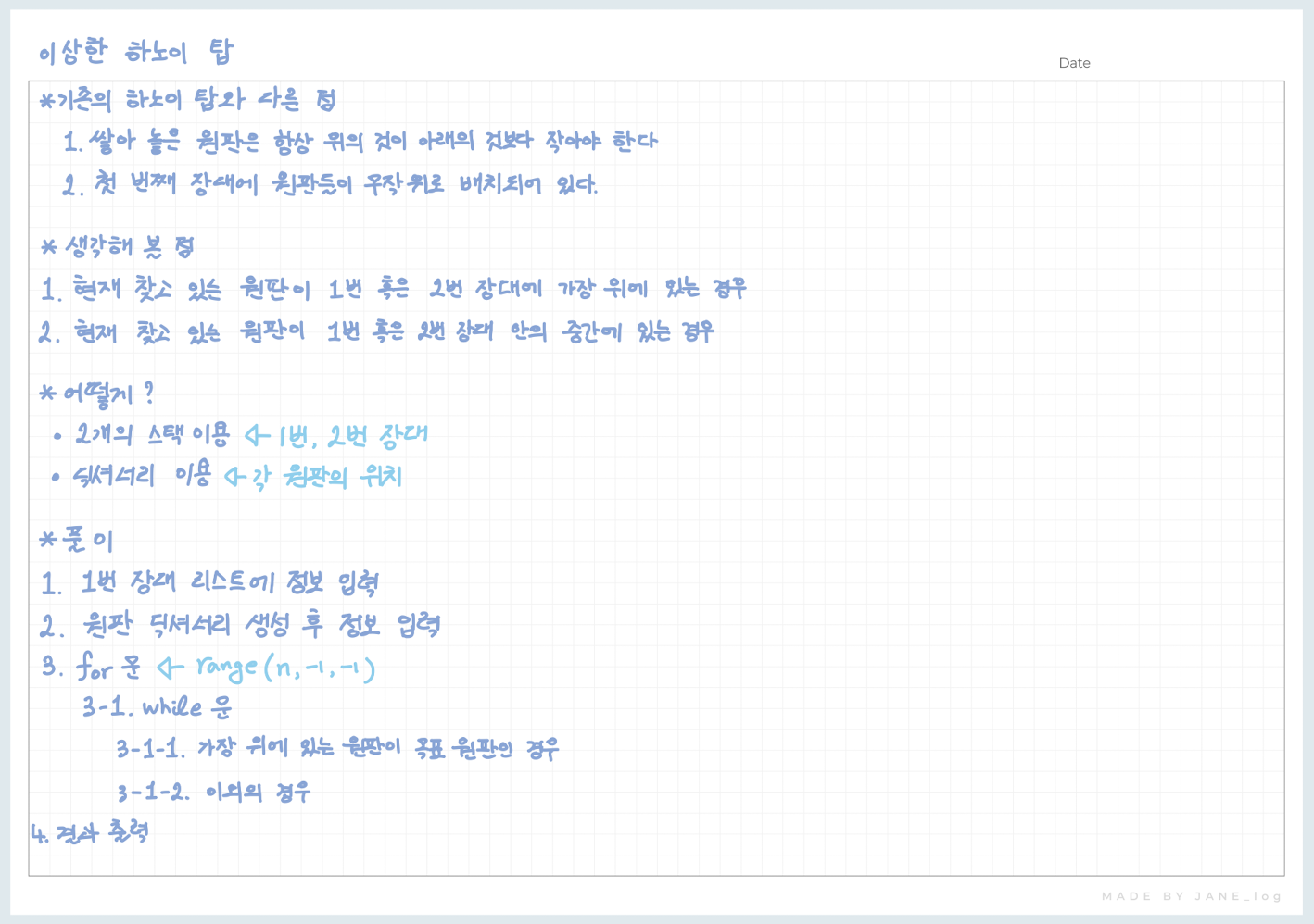 이상한 하노이 탑 문제와 기존 하노이 탑 문제와 다른 점이 2가지가 있는데 하나는 "쌓아 놓은 원판은 항상 위의 것이 아래의 것보다 작아야 한다.(중간 과정 역시 그래야함)" 라는 조건이 삭제되었다는 점이고 또 다른 하나는 첫 번째 장대에 원판들이 반경 상관없이 무작위로 배치되어 있다는 점이다.