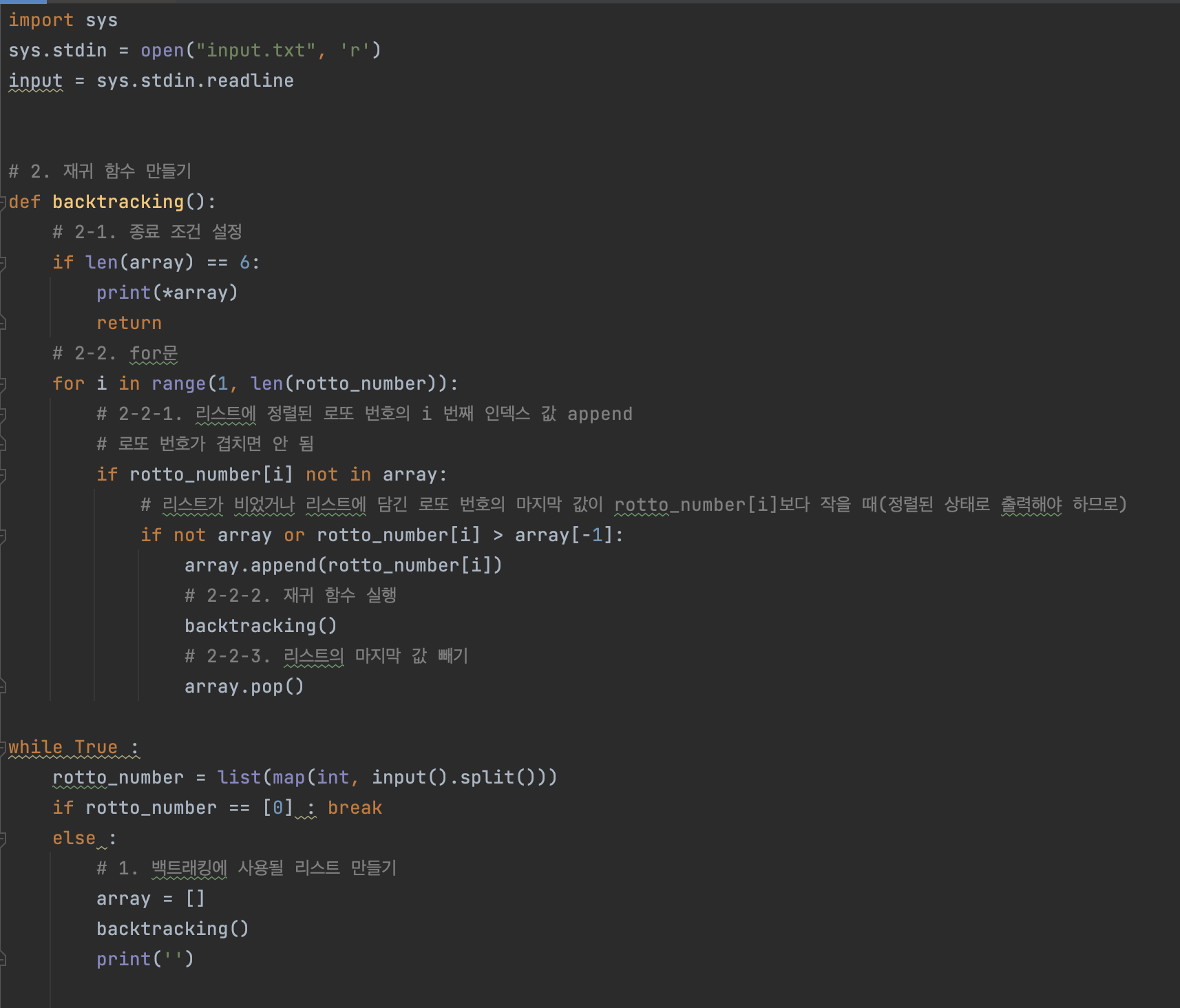 입력은 여러 개의 테스트 케이스로 이루어져 있다. 각 테스트 케이스는 한 줄로 이루어져 있다. 첫 번째 수는 k (6 < k < 13)이고, 다음 k개 수는 집합 S에 포함되는 수이다. S의 원소는 오름차순으로 주어진다.