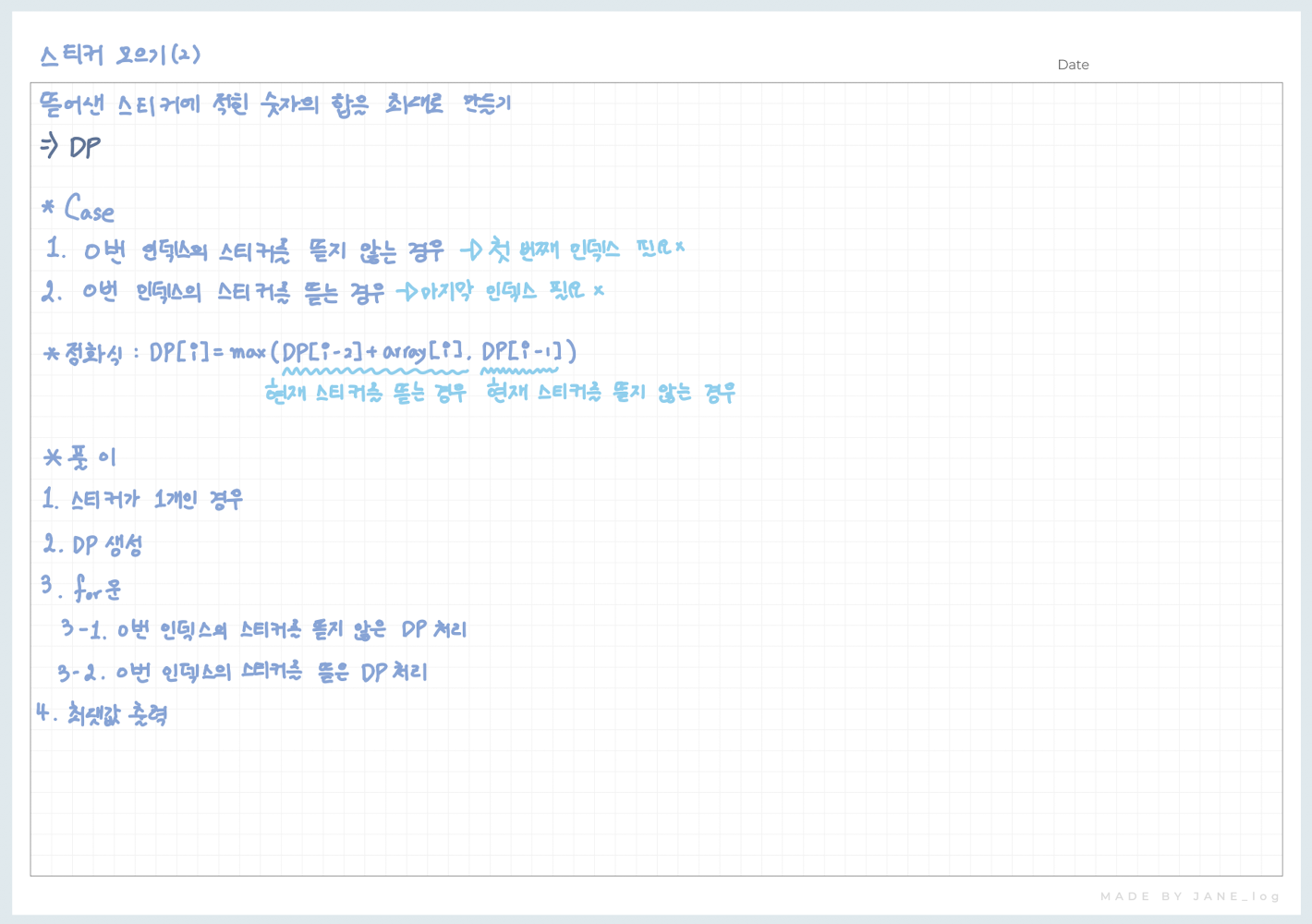 원형으로 연결된 스티커에서 몇 장의 스티커를 뜯어내어 뜯어낸 스티커에 적힌 숫자의 합이 최대가 되도록 하고 싶습니다. 단 스티커 한 장을 뜯어내면 양쪽으로 인접해있는 스티커는 찢어져서 사용할 수 없게 됩니다.