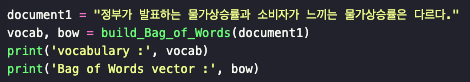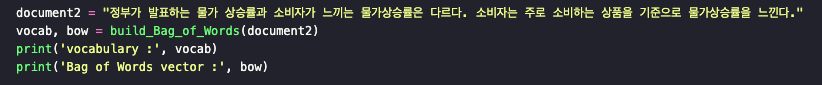 문서1에 각 단어에 대해서 인덱스를 부여한 결과는 첫 번째 출력 결과이다. 문서1의 BoW는 두 번째 출력 결과이다. 두번째 출력 결과를 보면, 인덱스 4에 해당하는 물가상승률은 2번 언급되었기 때문에 인덱스 4에 해당하는 값이 2이다.