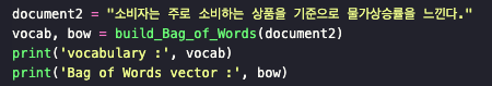 vocabulary : {'소비자': 0, '는': 1, '주로': 2, '소비': 3, '하는': 4, '상품': 5, '을': 6, '기준': 7, '으로': 8, '물가상승률': 9, '느낀다': 10}