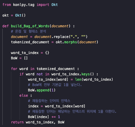 한국어 예제를 통해서 BoW에 대해서 이해해보자.
