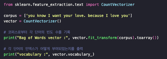 사이킷 런에서는 단어의 빈도를 Count하여 vector로 만드는 CountVectorizer 클래스를 지원한다. 이를 이용하면 영어에 대해서는 쉽게 BoW를 만들 수 있다.