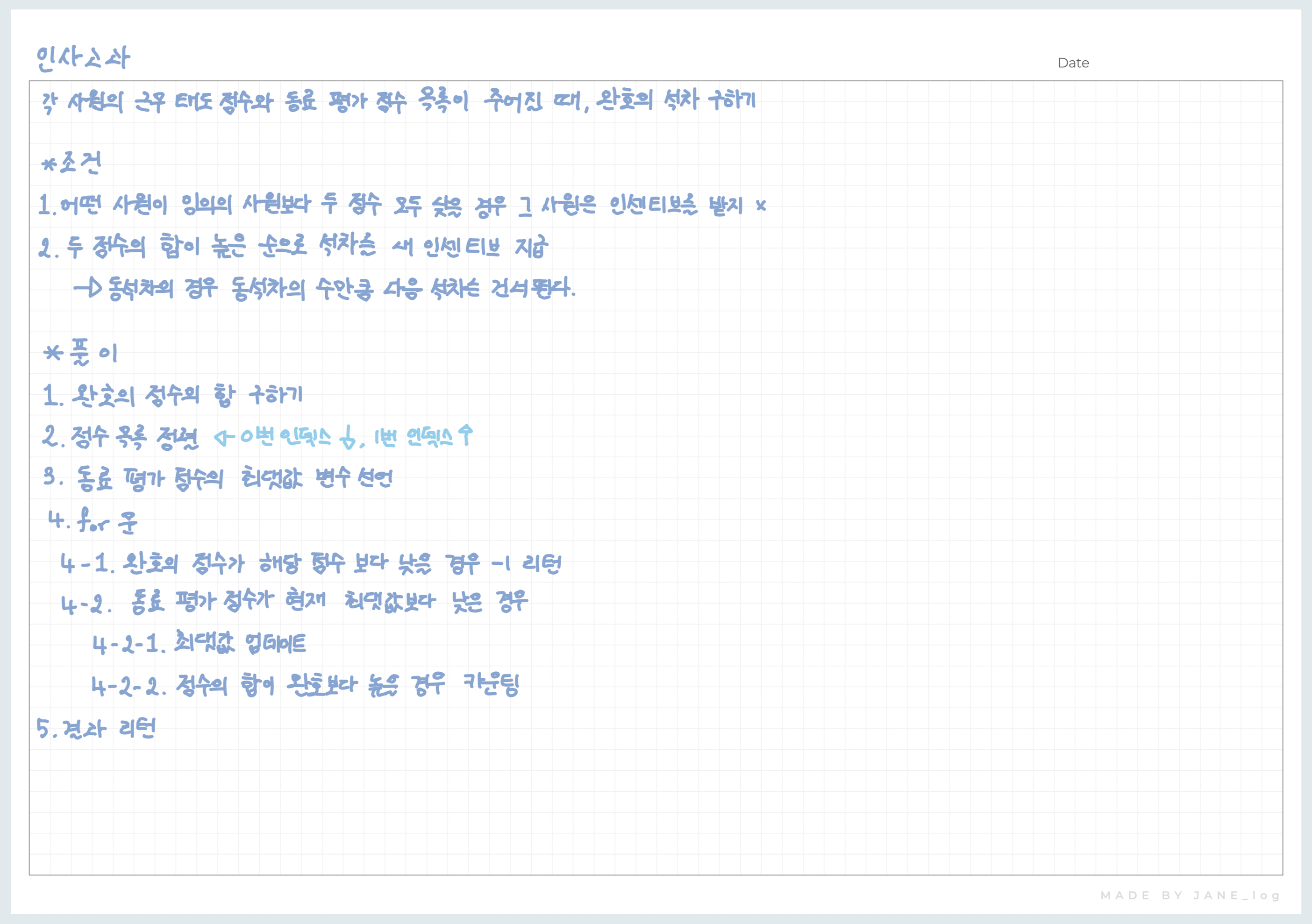 완호네 회사는 연말마다 1년 간의 인사고과에 따라 인센티브를 지급합니다. 각 사원마다 근무 태도 점수와 동료 평가 점수가 기록되어 있는데 만약 어떤 사원이 다른 임의의 사원보다 두 점수가 모두 낮은 경우가 한 번이라도 있다면 그 사원은 인센티브를 받지 못합니다. 그렇지 않은 사원들에 대해서는 두 점수의 합이 높은 순으로 석차를 내어 석차에 따라 인센티브가 차등 지급됩니다. 이때, 두 점수의 합이 동일한 사원들은 동석차이며, 동석차의 수만큼 다음 석차는 건너 뜁니다. 예를 들어 점수의 합이 가장 큰 사원이 2명이라면 1등이 2명이고 2등 없이 다음 석차는 3등부터입니다.