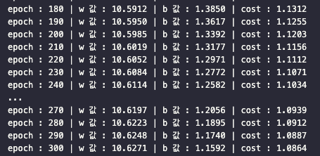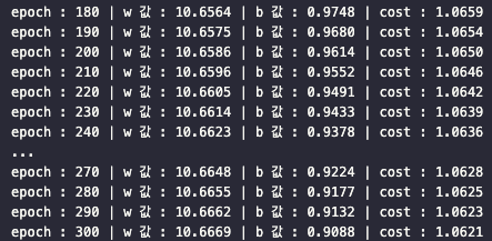 print("epoch : {:3} | w 값 : {:5.4f} | b 값 : {:5.4f} | cost : {:5.4f}".format(i, w.item(), b.item(), cost.item()))