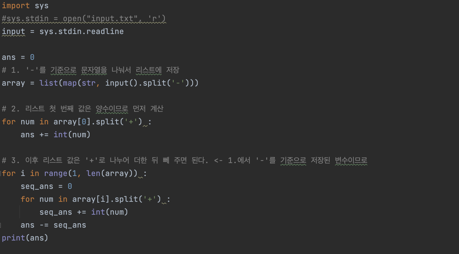 첫째 줄에 식이 주어진다. 식은 ‘0’~‘9’, ‘+’, 그리고 ‘-’만으로 이루어져 있고, 가장 처음과 마지막 문자는 숫자이다. 그리고 연속해서 두 개 이상의 연산자가 나타나지 않고, 5자리보다 많이 연속되는 숫자는 없다. 수는 0으로 시작할 수 있다. 입력으로 주어지는 식의 길이는 50보다 작거나 같다.