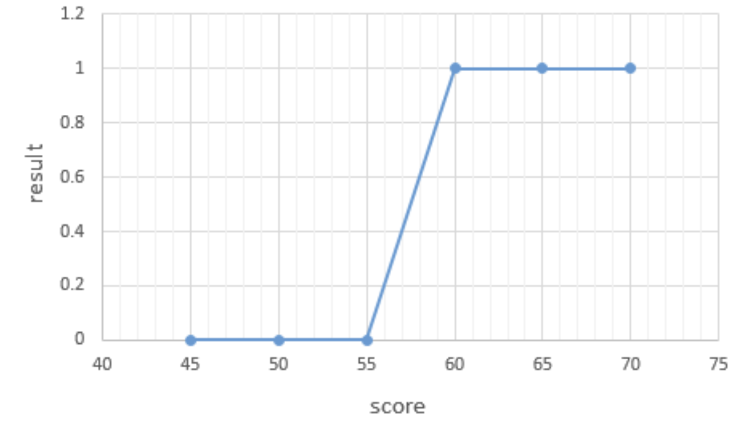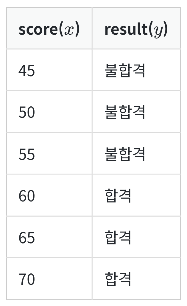 학생들이 시험 성적에 따라 합격, 불합격이 기재된 데이터가 있다고 가정해보자. 시험 성적이 x라면, 합불 결과는 y이다. 이 데이터로부터 특정 점수를 얻었을 때의 합격, 불합격 여부를 판정하는 모델을 만들고자 한다.