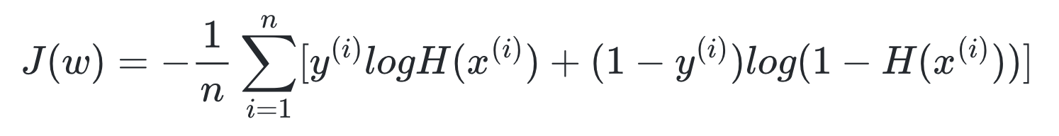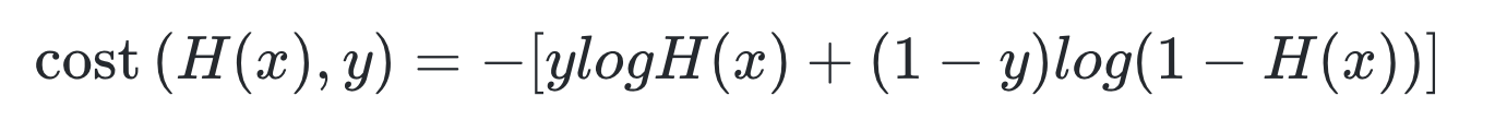 자세히 보면 y와 (1-y)가 식 중간에 들어갔고, 두 개의 식을 -로 묶은 것 외에는 기존의 두 식이 들어가있는 것을 볼 수 있다. y가 0이면 ylogH(x)가 없어지고, y가 1이면 (1-y)log(1-H(x))가 없어지는데 이는 각각 y가 1일 때와 0일 때의 앞서 본 식과 동일하다.