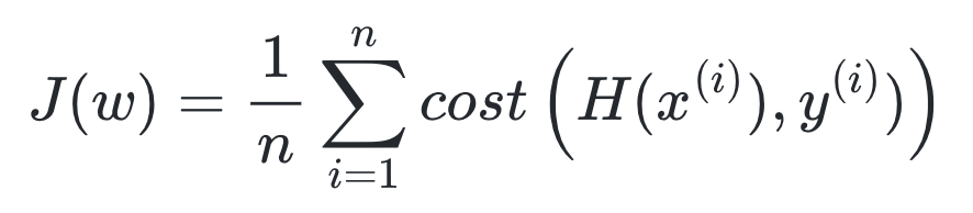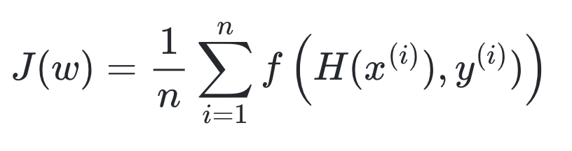 아직 완성된 식이 아니다. 위의 식에서 샘플 데이터의 개수가 n개이고, 어떤 함수 f가 실제값과 예측값의 오차를 나타내는 함수라고 할 때, 여기서 새로운 함수 f를 어떻게 정의하느냐에 따라서 가중치를 최소화하는 적절한 목적 함수가 완성된다. 목적 함수는 전체 데이터에 대홰서 어떤 함수 f의 값의 평균을 계산하고 있다. 적절한 가중치를 찾기 위해서 결과적으로 실제값과 예측값에 대한 오차를 줄여야 하므로 여기서 이 f는 비용 함수라고 하자. 식을 다시 쓰면 아래와 같다.