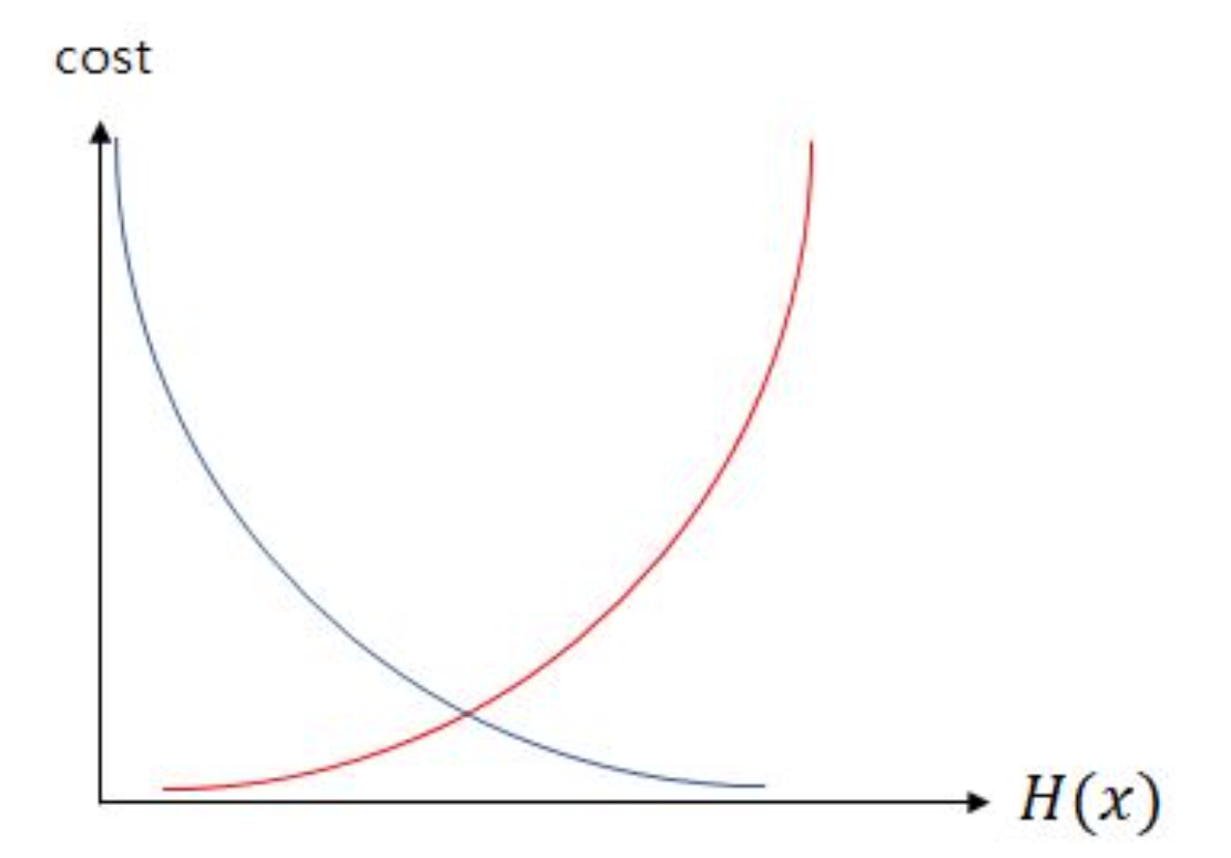 y값의 실제값이 1일 때 -logH(x) 그래프를 사용하고 y의 실제값이 0일 때 -log(1-H(x)) 그래프를 사용해야 한다. 위의 두 식을 그래프 상으로 표현하면 아래와 같다.