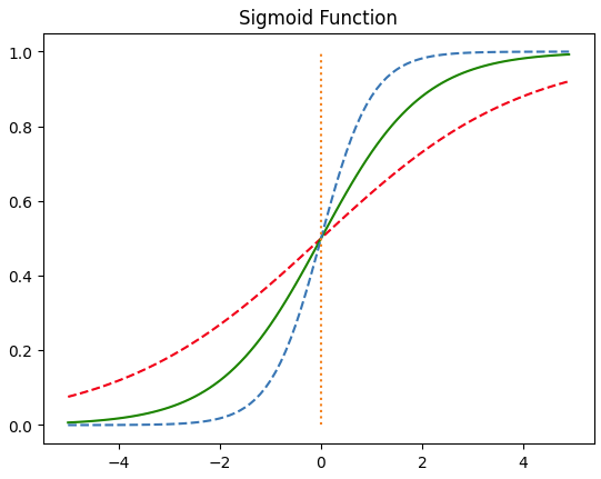 위 그래프는 w값이 0.5일 때 빨간색 선, w값이 1일 때 초록색 선, w값이 2일 때 파란색 선이 나오도록 하였다. 위와 같이 w 값에 따라 그래프의 경사도가 변한다. 선형회귀에서 직선을 표현할 때, 가중치 w는 직선의 기울기를 의미했지만 여기서는 그래프의 경사도를 결정한다. w의 값이 커지면 경사가 커지고 w의 값이 작아지면 경사가 작아진다.