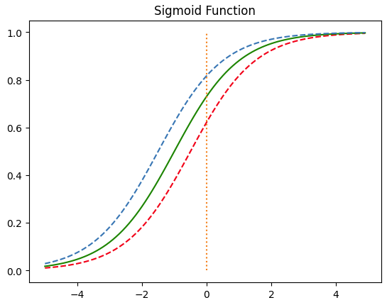 위 그래프는 b의 값에 따라서 그래프가 이동하는 것을 보여준다. 시그모이드 함수는 입력값이 커지면 1에 수렴하고, 입력값이 작아지면 0에 수렴한다. 0부터 1까지의 값을 가지는데 출력값이 0.5 이상이면 1(True), 0.5 이하면 0(False)로 만들면 이진 분류 문제를 풀기 위해서 사용할 수 있다.