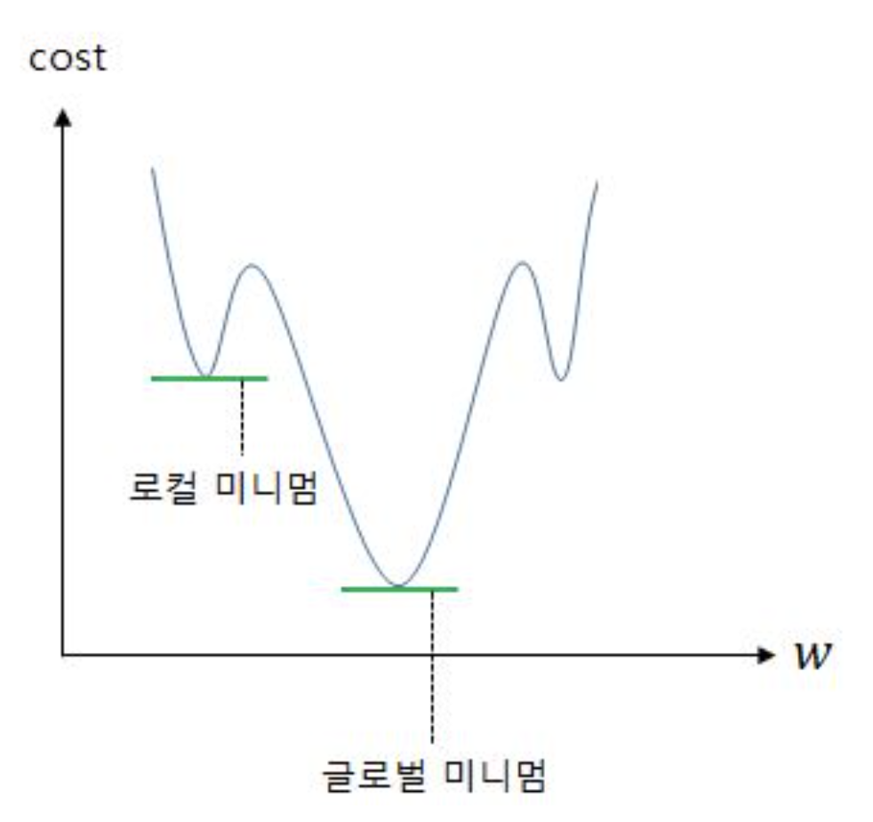 로지스틱 회귀에서 평균 제곱 오차를 비용 함수로 사용하면, 경사 하강법을 사용했을 때 찾고자 하는 최소값이 아닌 잘못된 최소값에 빠질 가능성이 매우 높다. 이를 전체 함수에 걸쳐 최소값이 아닌 글로벌 미니멈(Global Minimum)이 아닌 특정 구역에서의 최소값인 로컬 미니멈(Local Minimum)에 도달했다고 한다. 로컬 미니멈에 지나치게 쉽게 빠지는 비용 함수는 cost가 가능한한 최소가 되는 가중치 w를 찾는다는 목적에 좋지 않은 선택이다. 그리고 로지스틱 회귀에서의 평균 제곱 오차는 바로 그 좋지 않은 선택에 해당된다.