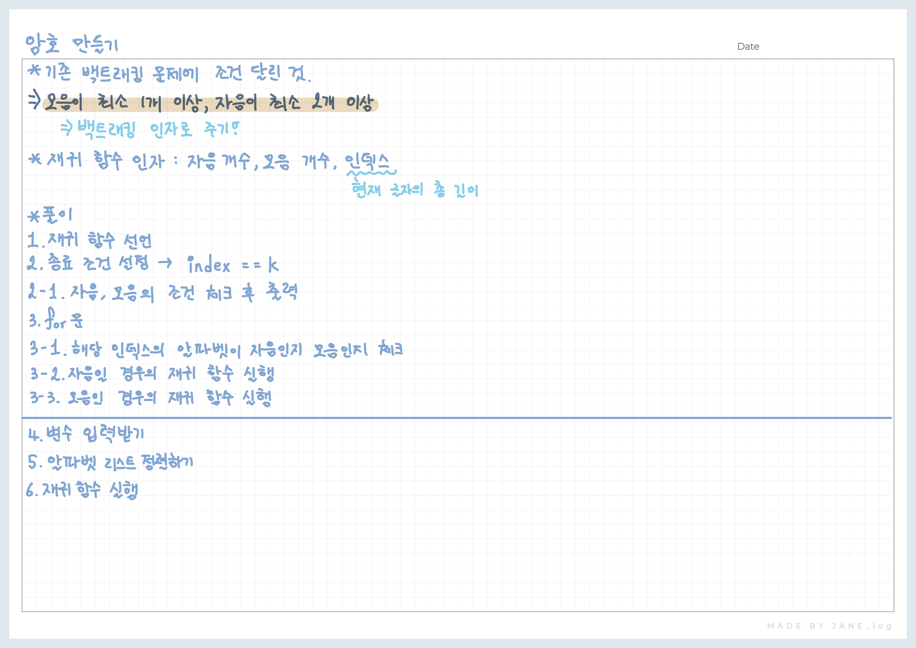 암호는 서로 다른 L개의 알파벳 소문자들로 구성되며 최소 한 개의 모음(a, e, i, o, u)과 최소 두 개의 자음으로 구성되어 있다고 알려져 있다. 또한 정렬된 문자열을 선호하는 조교들의 성향으로 미루어 보아 암호를 이루는 알파벳이 암호에서 증가하는 순서로 배열되었을 것이라고 추측된다. 즉, abc는 가능성이 있는 암호이지만 bac는 그렇지 않다.