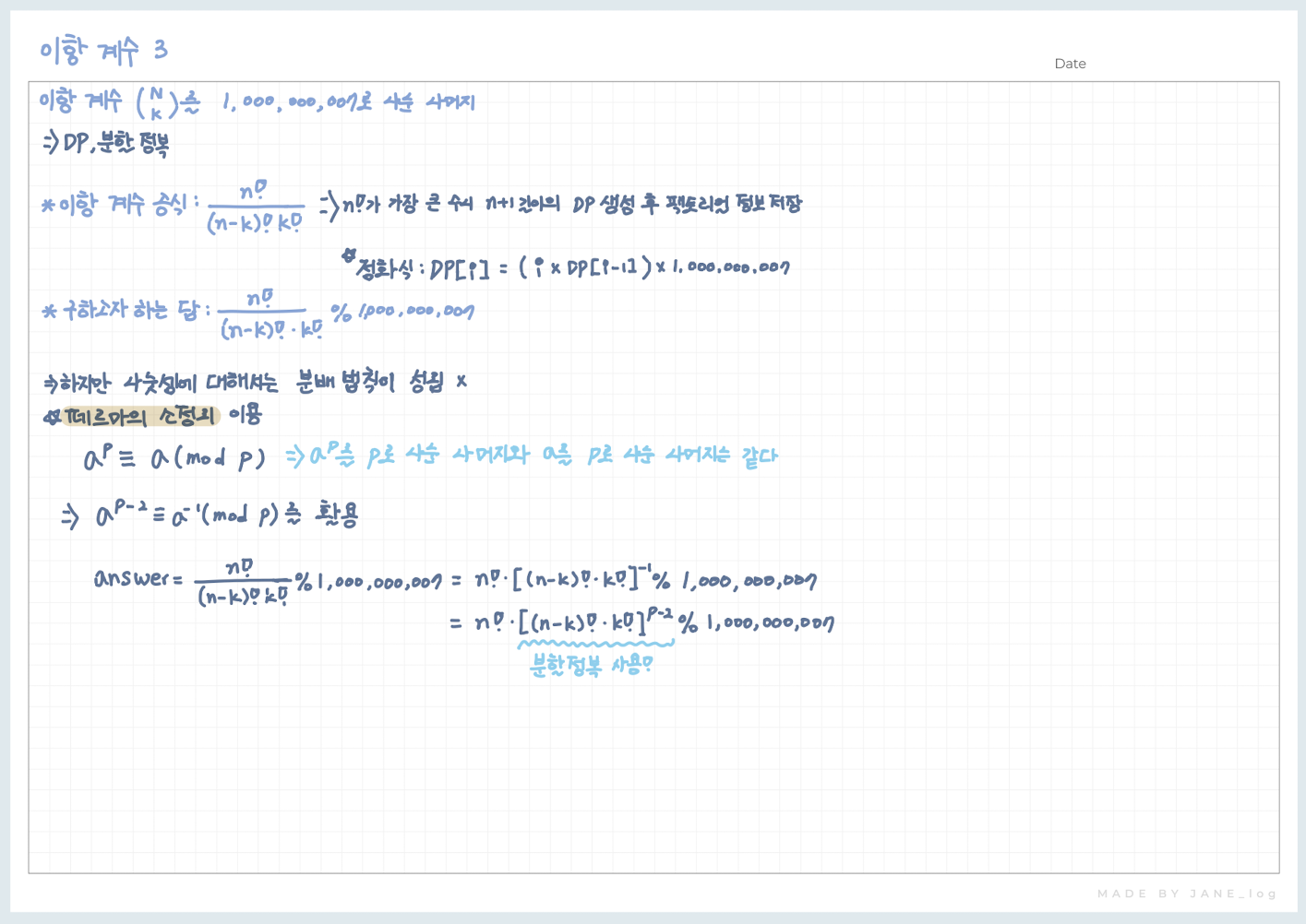 자연수 과 정수 가 주어졌을 때 이항 계수 를 1,000,000,007로 나눈 나머지를 구하는 프로그램을 작성하시오.