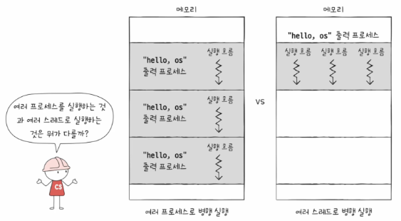 동일한 작업을 수행하는 단일 스레드 프로세스를 여러 개 실행하는 멀티 프로세스와 하나의 프로세스를 여러 스레드로 실행하는 멀티 프로세스는 어떤 차이가 있을까?
