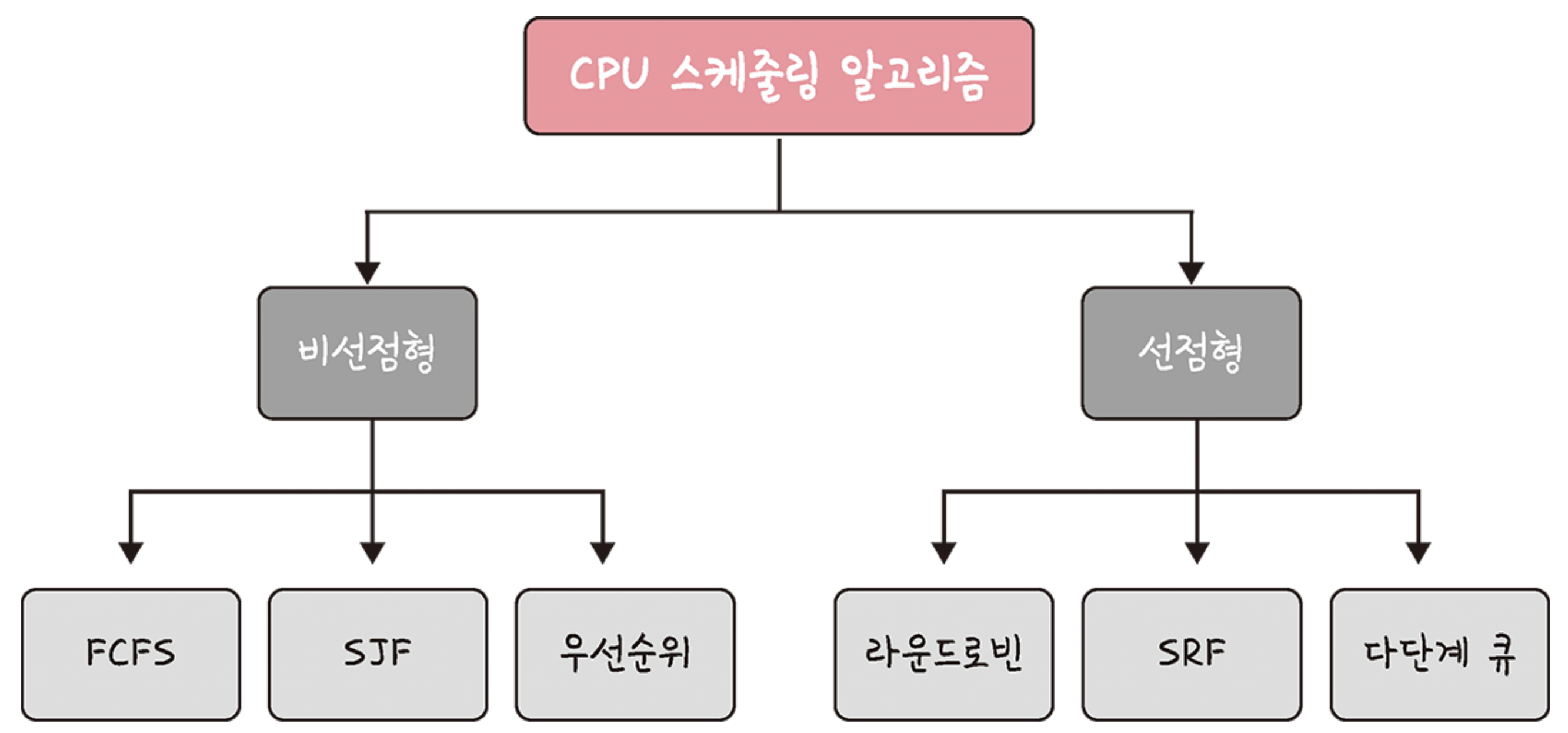 선점형 방식은 현대 운영체제가 쓰는 방식으로 지금 사용하고 있는 프로세스를 알고리즘에 의해 중단시켜 버리고 강제로 다른 프로세스에 CPU 소유권을 할당하는 방식이다.