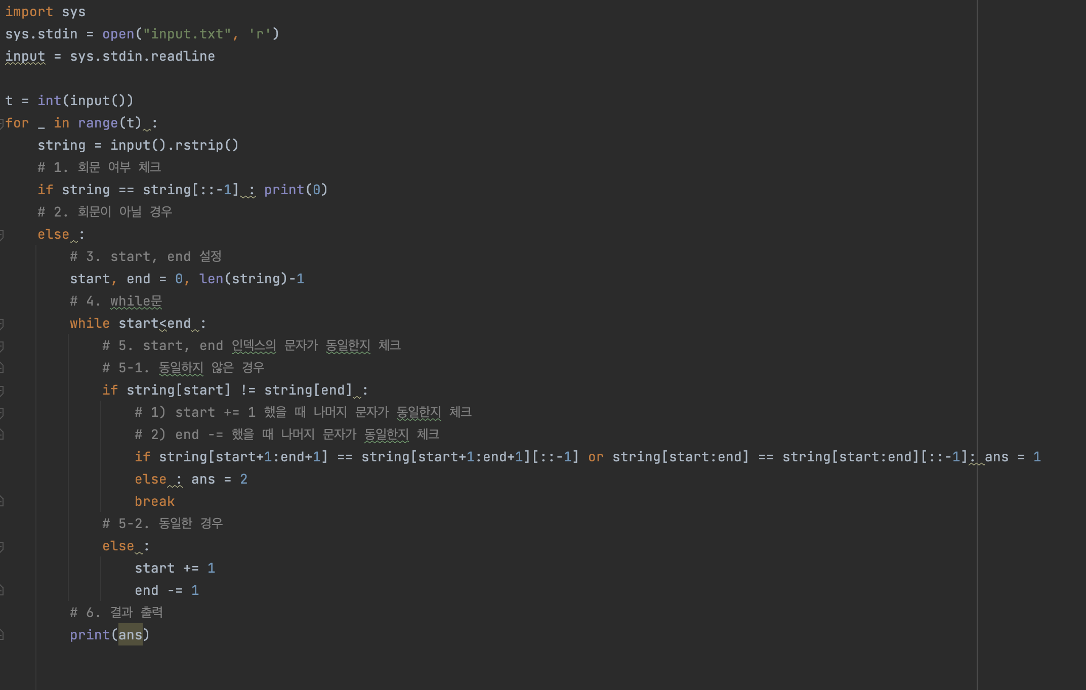 여러분은 제시된 문자열을 분석하여 그것이 그 자체로 회문인지, 또는 한 문자를 삭제하면 회문이 되는 “유사회문”인지, 아니면 회문이나 유사회문도 아닌 일반 문자열인지를 판단해야 한다. 만일 문자열 그 자체로 회문이면 0, 유사회문이면 1, 그 외는 2를 출력해야 한다.