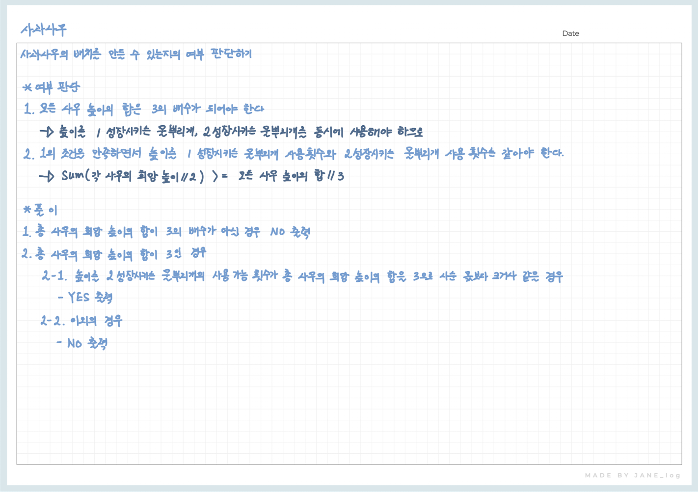 # 1. 총 나무의 희망 높이의 합이 3의 배수가 아닐 경우 NO 출력