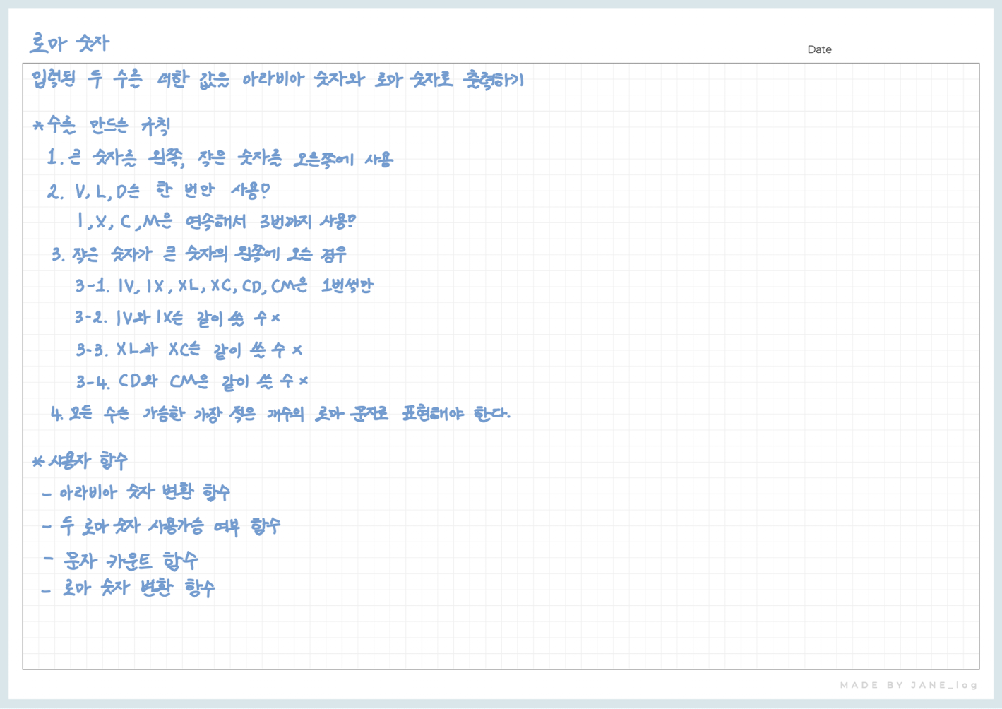 - 모든 수는 가능한 가장 적은 개수의 로마 숫자들로 표현해야 한다. 예를 들어 60 은 LX 이지 XLXX 가 아니고, 5 는 V 이지 IVI 가 아니다.
