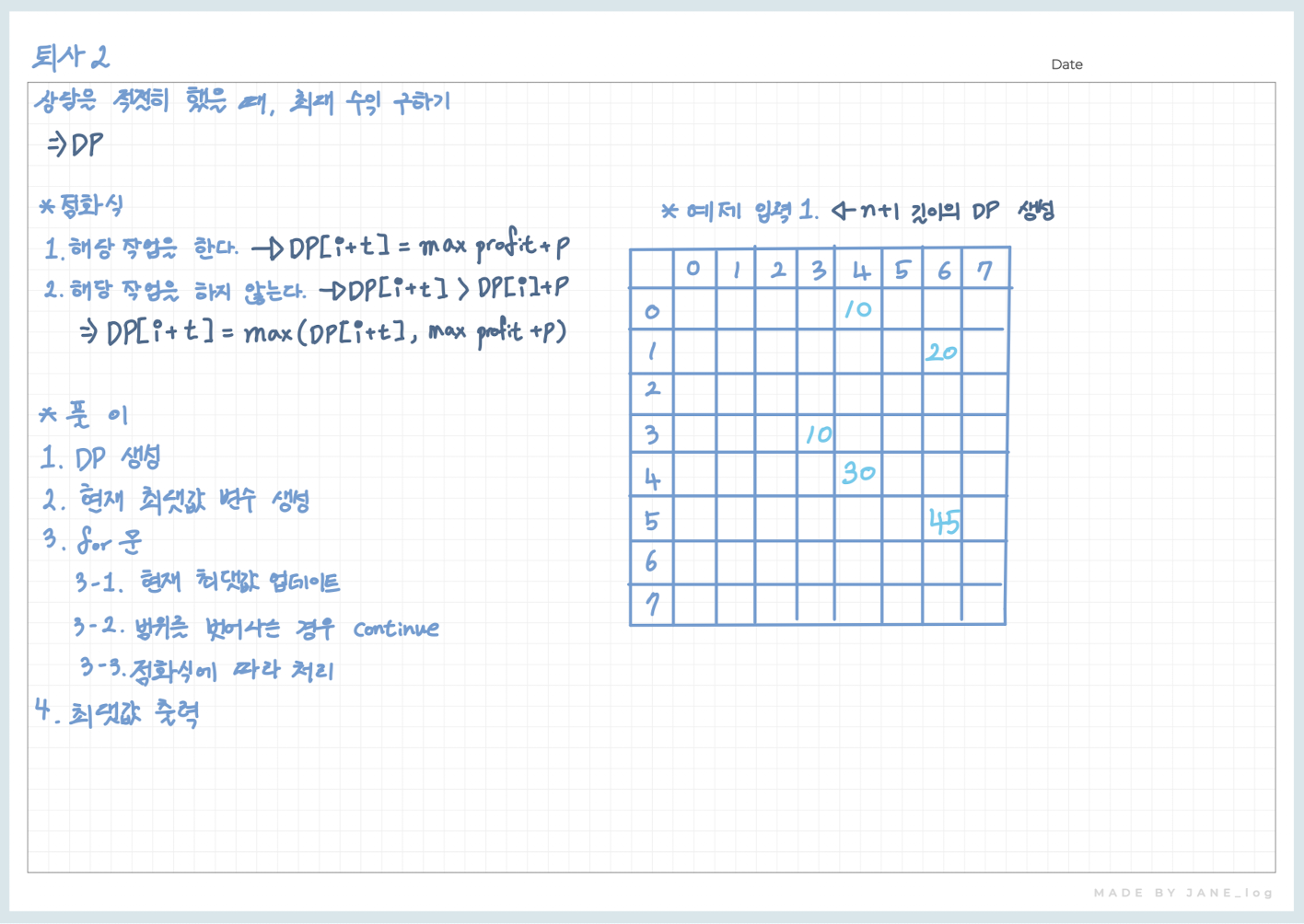 오늘부터 N+1일째 되는 날 퇴사를 하기 위해서, 남은 N일 동안 최대한 많은 상담을 하려고 한다.