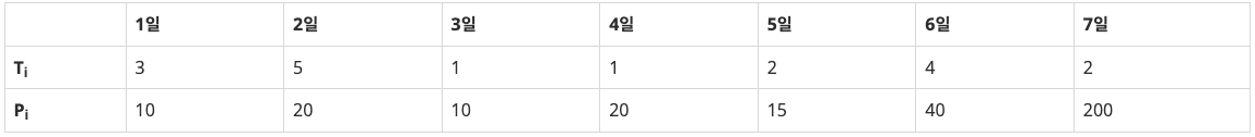 각각의 상담은 상담을 완료하는데 걸리는 기간 Ti와 상담을 했을 때 받을 수 있는 금액 Pi로 이루어져 있다.
