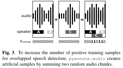 overlapped speech detection은 최소 2명의 화자가 동시에 말하는 영역을 감지하는 작업이다. 이 작업은 K = 2인 동일한 sequence labeling 이론을 사용하는 pyannote.audio에서 처리된다. : time step $ t $에 화자가 0명 또는 1명일 경우 $ y_{t} = 0 $, 화자가 2명 이상일 경우 $ y_{t} = 1이다. class imbalance 문제를 해결하기 위해 Fig 3.에 표시된 것처럼 training sub-sequences의 절반은 두 개의 무작위 sub-sequence의 가중치 합으로 인위적으로 만들어진다. 테스트 시 예측 점수가 조정 가능한 threshold $ \vartheta_{OSD} $보다 큰 time step.은 중복된 음성으로 표시된다. Table 3.에 나와있는 것처럼 다양한 데이터셋에서 최첨단 성능에 도달하는 pre-trained model을 사용할 수 있다.