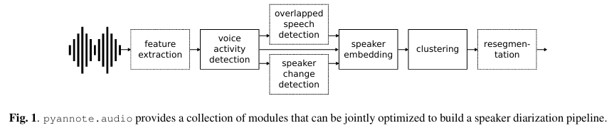 pyannote.audio.labeling은 voice activity detection, speaker change detection, overlapped speech detection, 심지어 re-segmentation을 포함한 여러 speaker diarization sub-module을 위한 신경망을 훈련하는 통합 프레임워크를 제공한다.