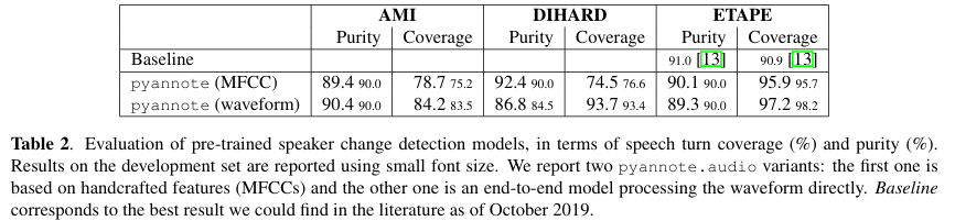 Speaker change detection은 주어진 audio stream이나 녹음에서 화자 변경 지점을 감지하는 작업이다. time step $ t $에서 화자 변경이 없으면 $ y_{t} = 0 $, 있으면 $ y_{t} = 1 $의 동일한 sequence labeling 원리를 사용해 pyannote.audio에서 처리할 수 있다. 주소를 지정하려면 class imbalance 문제를 해결하고 human annotation imprecision을 설명하기 위해, 화자 변경 지점 $ t_{}^{*} $의 가까운 일시적인 time step $ \{t | \left|t - t_{}^{*} \right| < \delta \} $는 훈련에 인위적으로 양수로 레이블로 지정된다. 실제로, $ \delta $의 자속 순서는 200ms이다. 테스트 시에는 예측 점수 로컬 최댓값에 해당하고 조정 가능한 threshold $ \vartheta_{SCD} $보다 큰 시간 단계가 스피커 변경 지점으로 표시된다. 전반적으로 이것은 원래 [Speaker Change Detection in Broadcast TV Using Bidirectional Long Short-Term Memory Networks]에서 설명한 speaker change detection의 버전을 구현한 것이다. Table 2.에 나와있는 것처럼 다양한 데이터셋에서 최첨단 성능에 도달하는 pre-trained model을 사용할 수 있다.