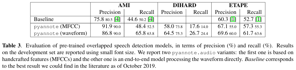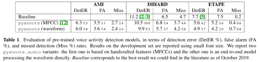 Voice activity detection은 주어진 audio stream이나 녹음에서 음성 영역을 감지하는 작업이다. 위의 원리를 이용해 pyannote.audio에서 K=2를 사용해 이를 해결할 수 있다. : time step $ t $에 음성이 없으면 $ y_{t} $는 0이고, 음성이 있으면 $ y_{t} $ = 1이다. 테스트 시 예측 점수가 조정 가능한 threshold $ \theta_{VAD} $보다 큰 단계는 음성으로 표시된다. Table 1.에 나와있는 것처럼 다양한 데이터셋에서 최첨단 성능에 도달하는 pre-trained model을 사용할 수 있다.