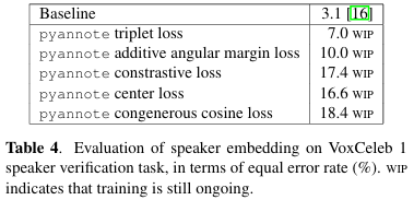 대신에, clustering step은 사전에 정의된(일반적으로 cosine) distance에 대해 직접 최적화된 speaker embedding을 훈련하기 위해 metric learning approach를 사용해 간소화되며, PLDA와 같은 기술의 필요성을 줄인다. Table 4.에 보고된 대로, 증가하는 metric learning approach collection이 pyannote.audio.embedding에 구현되어 이 접근 방식 모음에 대한 통합 프레임 워크를 제공한다.