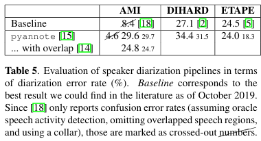 다른 블록과 마찬가지로, speaker embedding은 제작한 feature들이나 waveform에서 직접 end-to-end 방식으로 학습할 수 있다. pre-trained end-to-end model은 Vox Celeb speaker verification task에서 최첨단 성능에 도달하지 못하지만, Table 5.에서는 일부 speaker diarization test set에서 최첨단 성능으로 이어진다는 것을 보여준다.