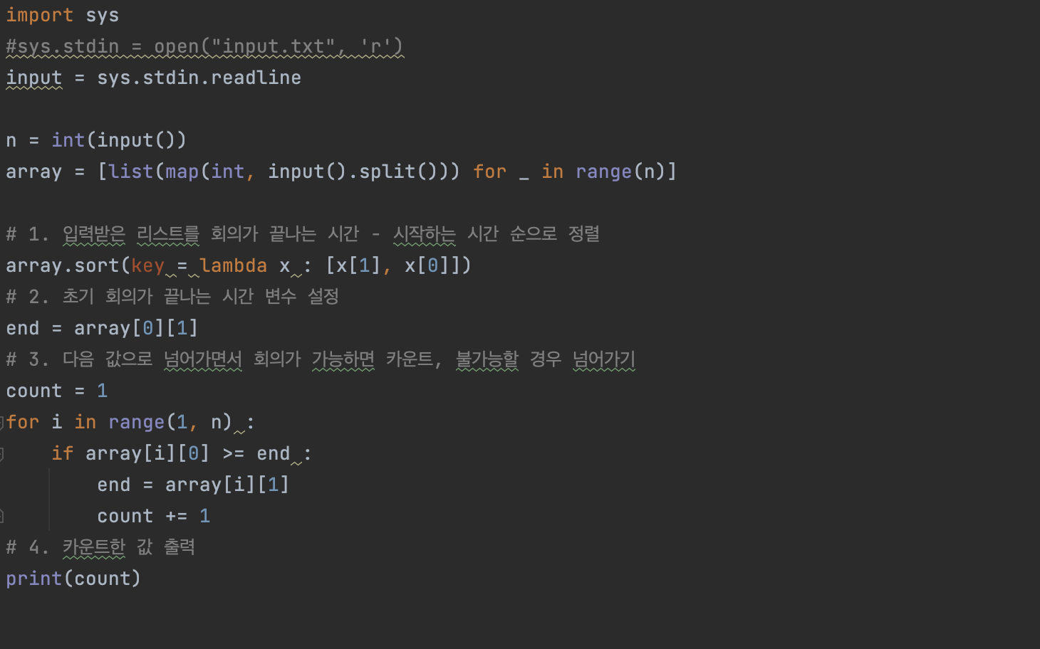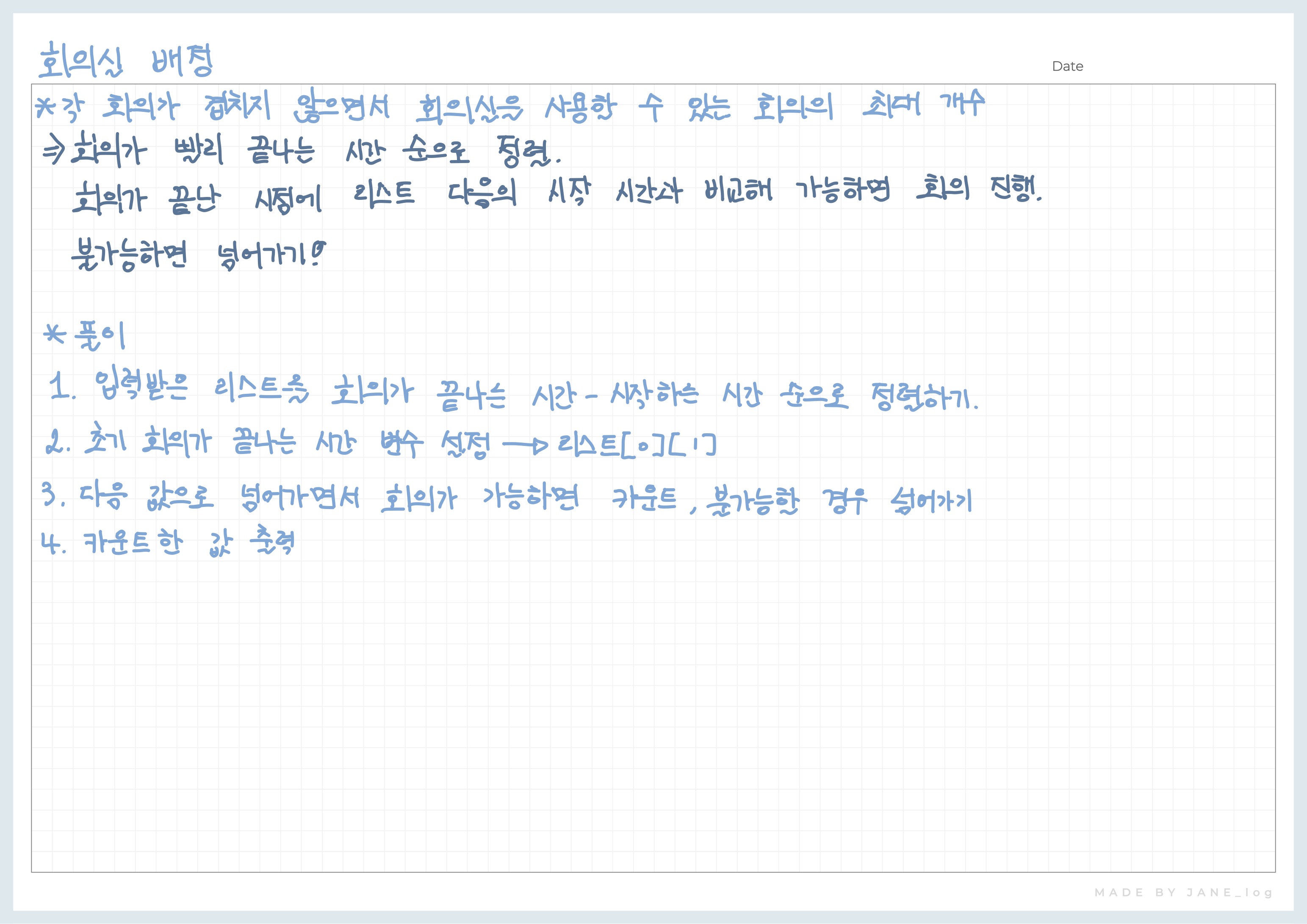 한 개의 회의실이 있는데 이를 사용하고자 하는 N개의 회의에 대하여 회의실 사용표를 만들려고 한다. 각 회의 I에 대해 시작시간과 끝나는 시간이 주어져 있고, 각 회의가 겹치지 않게 하면서 회의실을 사용할 수 있는 회의의 최대 개수를 찾아보자. 단, 회의는 한번 시작하면 중간에 중단될 수 없으며 한 회의가 끝나는 것과 동시에 다음 회의가 시작될 수 있다. 회의의 시작시간과 끝나는 시간이 같을 수도 있다. 이 경우에는 시작하자마자 끝나는 것으로 생각하면 된다.