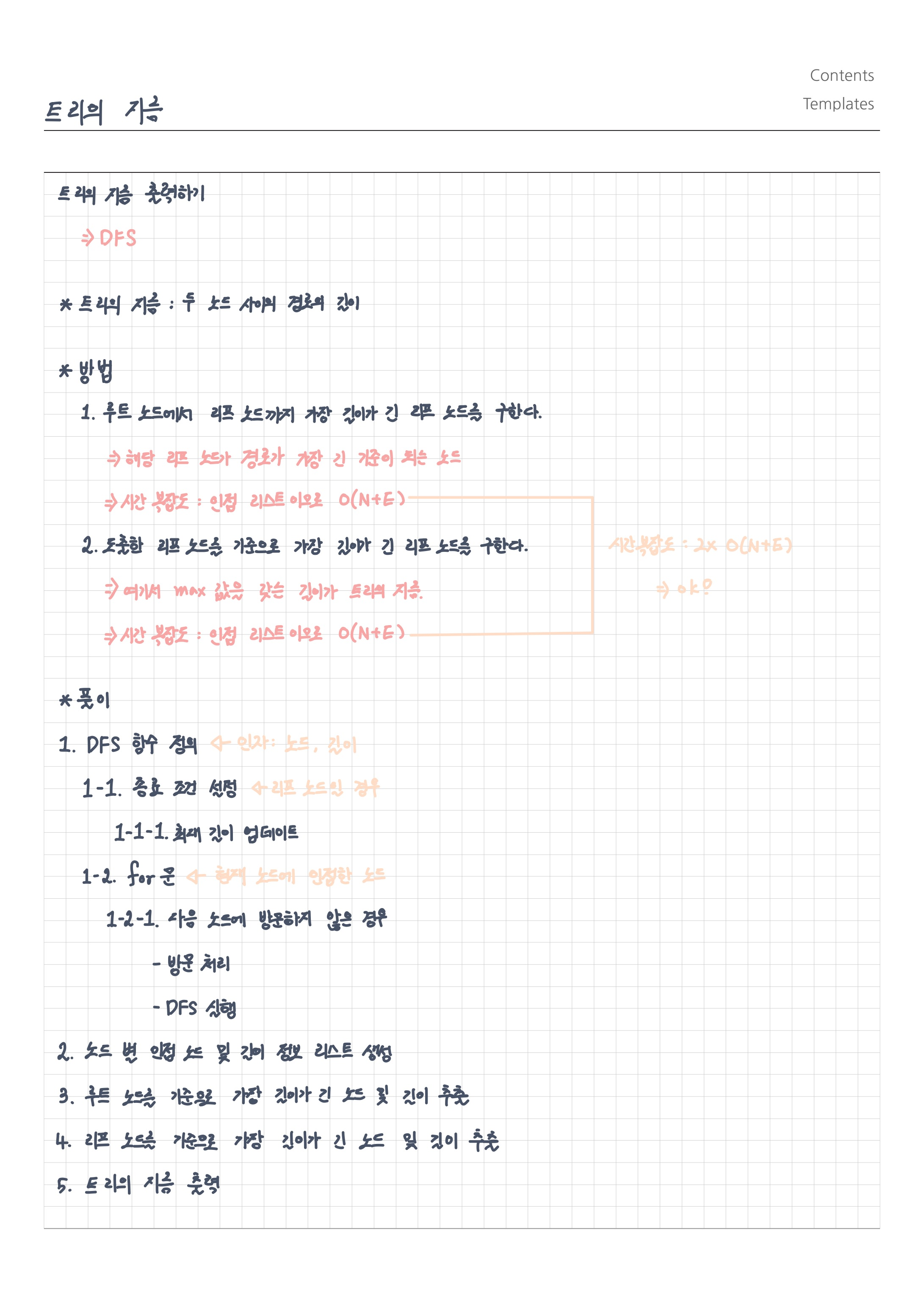 트리(tree)는 사이클이 없는 무방향 그래프이다. 트리에서는 어떤 두 노드를 선택해도 둘 사이에 경로가 항상 하나만 존재하게 된다. 트리에서 어떤 두 노드를 선택해서 양쪽으로 쫙 당길 때, 가장 길게 늘어나는 경우가 있을 것이다. 이럴 때 트리의 모든 노드들은 이 두 노드를 지름의 끝 점으로 하는 원 안에 들어가게 된다.