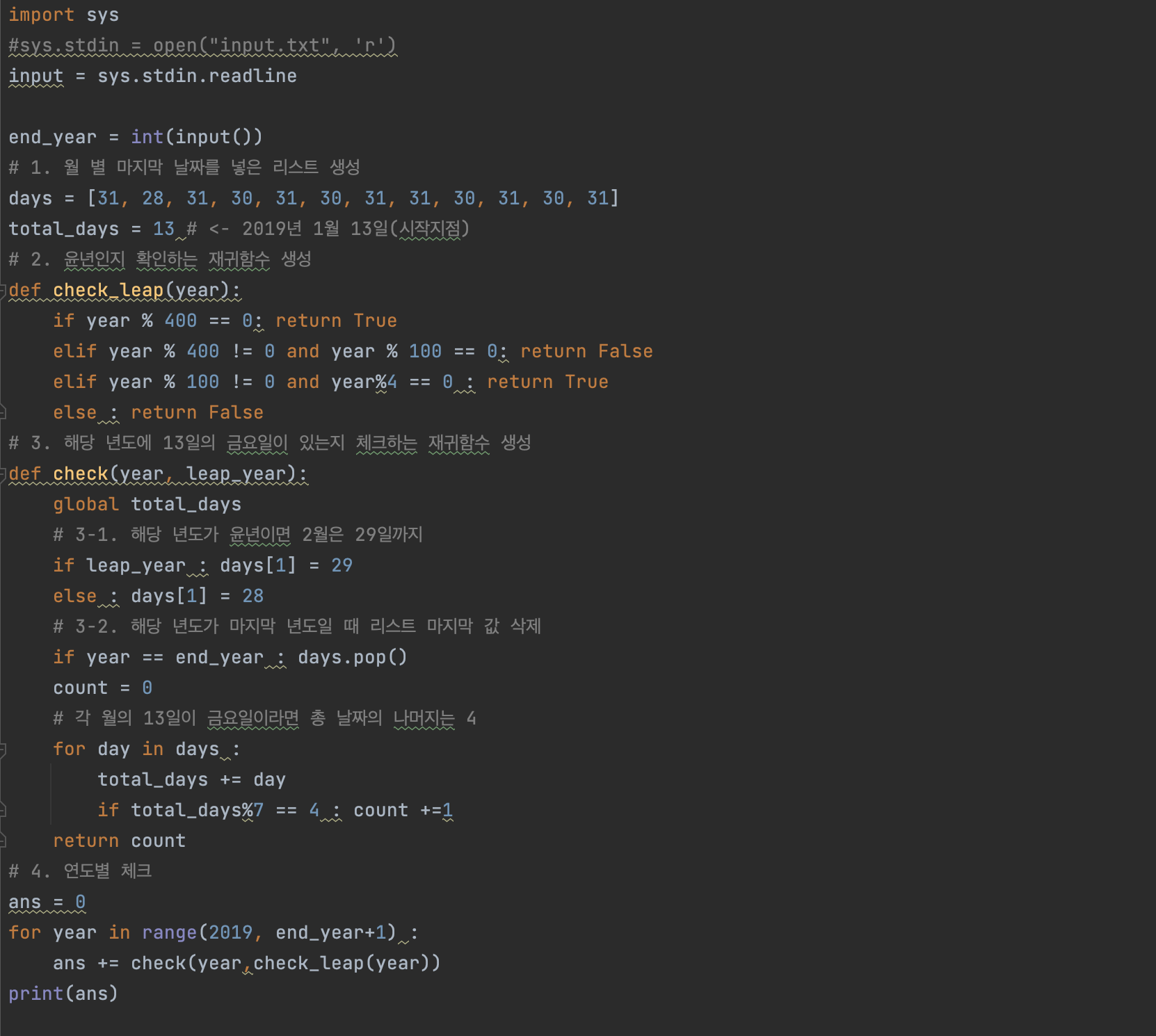 첫째 줄에 2019년부터 N년까지 누적되는 13일의 금요일의 수를 출력한다.