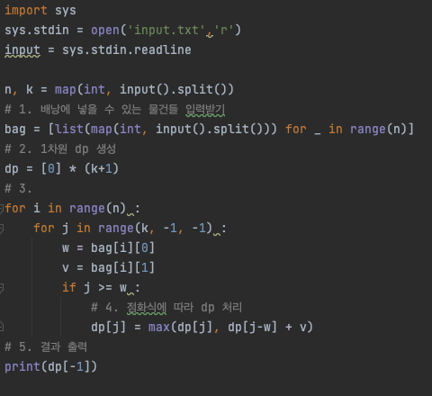 한 줄에 배낭에 넣을 수 있는 물건들의 가치합의 최댓값을 출력한다.