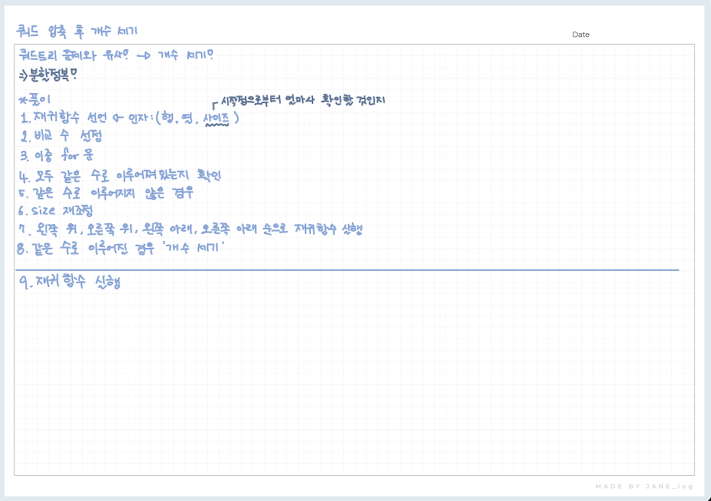 0과 1로 이루어진 2n x 2n 크기의 2차원 정수 배열 arr이 있습니다. 당신은 이 arr을 쿼드 트리와 같은 방식으로 압축하고자 합니다. 구체적인 방식은 다음과 같습니다.