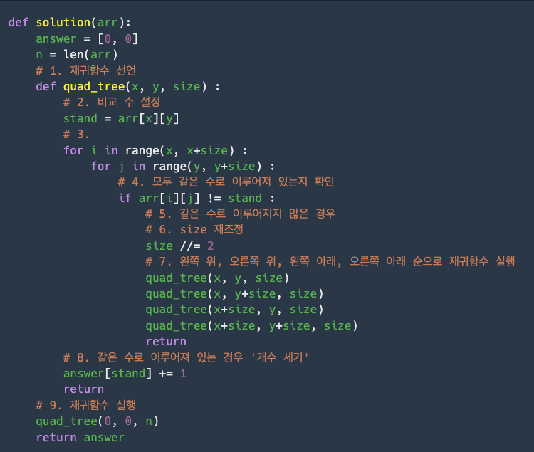 arr이 매개변수로 주어집니다. 위와 같은 방식으로 arr을 압축했을 때, 배열에 최종적으로 남는 0의 개수와 1의 개수를 배열에 담아서 return 하도록 solution 함수를 완성해주세요.