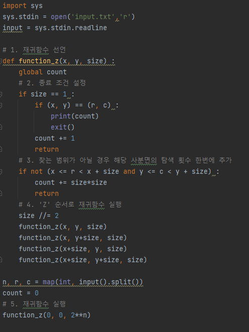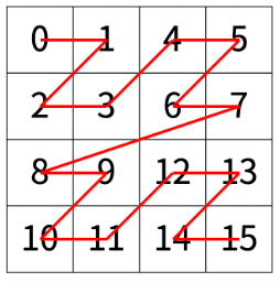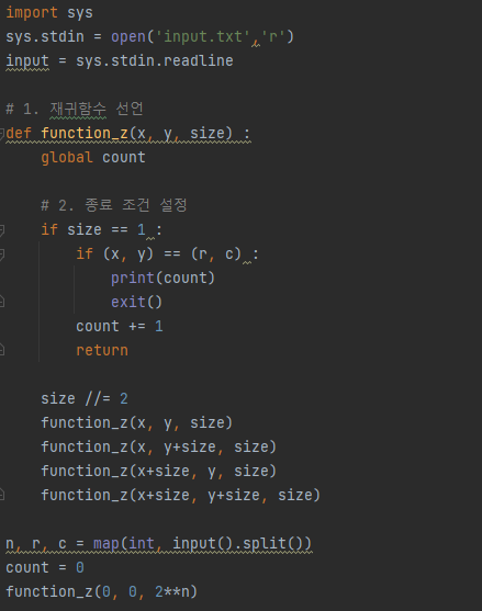 한수는 크기가 2N × 2N인 2차원 배열을 Z모양으로 탐색하려고 한다. 예를 들어, 2×2배열을 왼쪽 위칸, 오른쪽 위칸, 왼쪽 아래칸, 오른쪽 아래칸 순서대로 방문하면 Z모양이다.