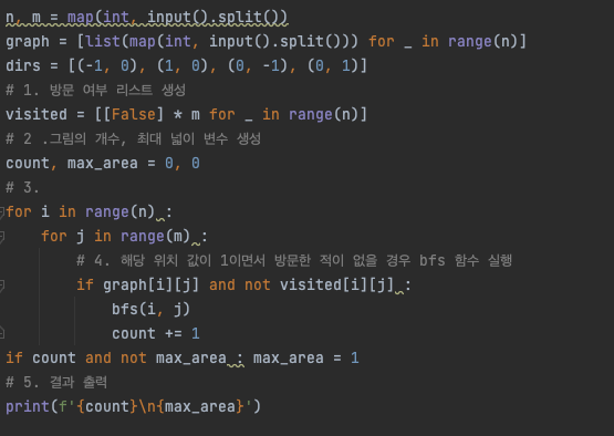 첫째 줄에는 그림의 개수, 둘째 줄에는 그 중 가장 넓은 그림의 넓이를 출력하여라. 단, 그림이 하나도 없는 경우에는 가장 넓은 그림의 넓이는 0이다.